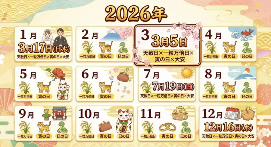 2026年のカレンダーを分析すると、例年以上に「吉日の重なり」が強力であることがわかります。特に、3月5日は「天赦日」「一粒万倍日」「寅の日」「大安」という、開運の4冠王が揃う歴史的な一日です。