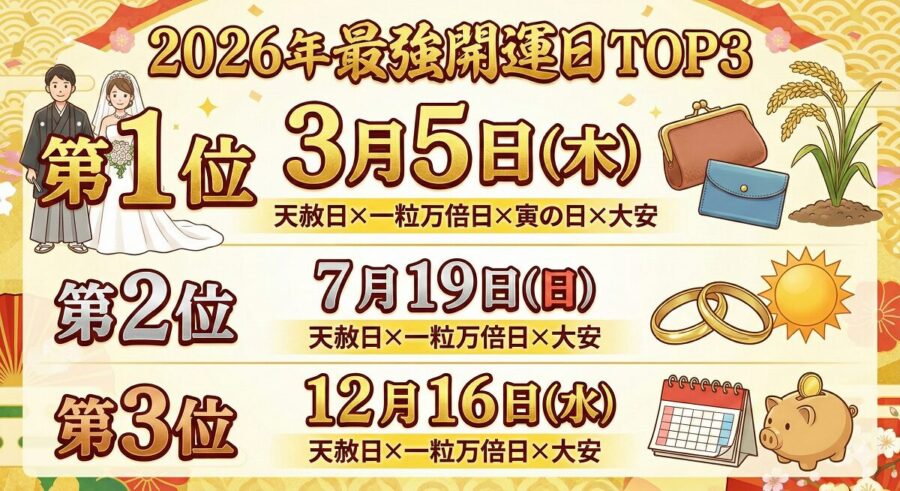 2026年にたくさんある吉日の中でも、特にいい運勢が重なっている日をランキングにしました。どの日に行動するか迷っている方は、まずこの5日をチェックしてみてくださいね。