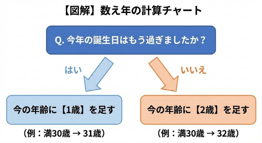 そのため、普段使っている年齢よりも1歳か2歳上の年齢になります。 もっと簡単に計算したい人は、今の自分の年齢を使って以下のどちらかで計算してみてください。